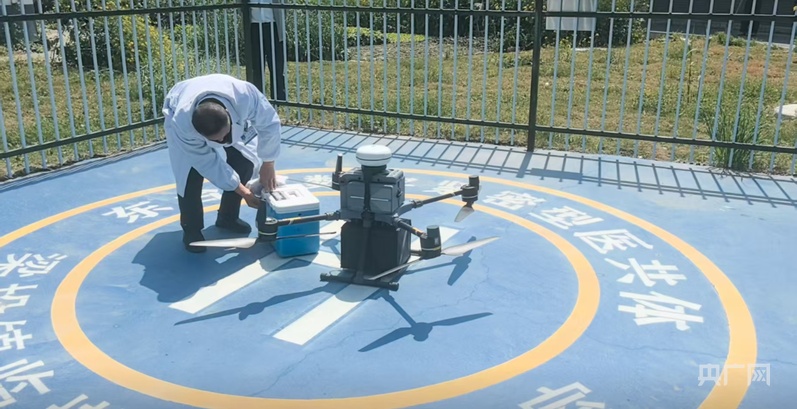 村医姚循拎着保温箱进入停机坪,打开无人机货箱,取出里面的塑料袋,再小心地将保温箱中的物品放入。“他把药拿下来,把今天早晨采的血样标本放进去。”江苏省东台市卫生健康委主任崔海介绍。